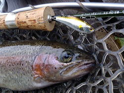 色々と各種ルアーを投入した結果,ネイティブでの釣りと同じように,レインボーは動きの速いものや激しいものには反応が薄かった。(むしろ逃げる)