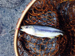 ![]() ヤマメの口からは消化途中のベイトフィッシュ・・ |