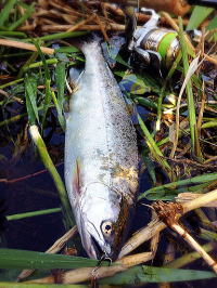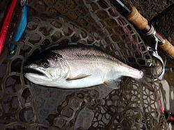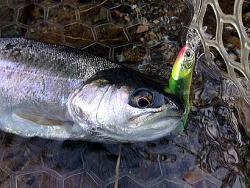 本日唯一のレインボーだ。顔も丸く、まだ幼い感じが抜けない。魚体。これは、DT50Sによる釣果だ。岸際をダウンでゆっくり引いて釣り上げることができた。